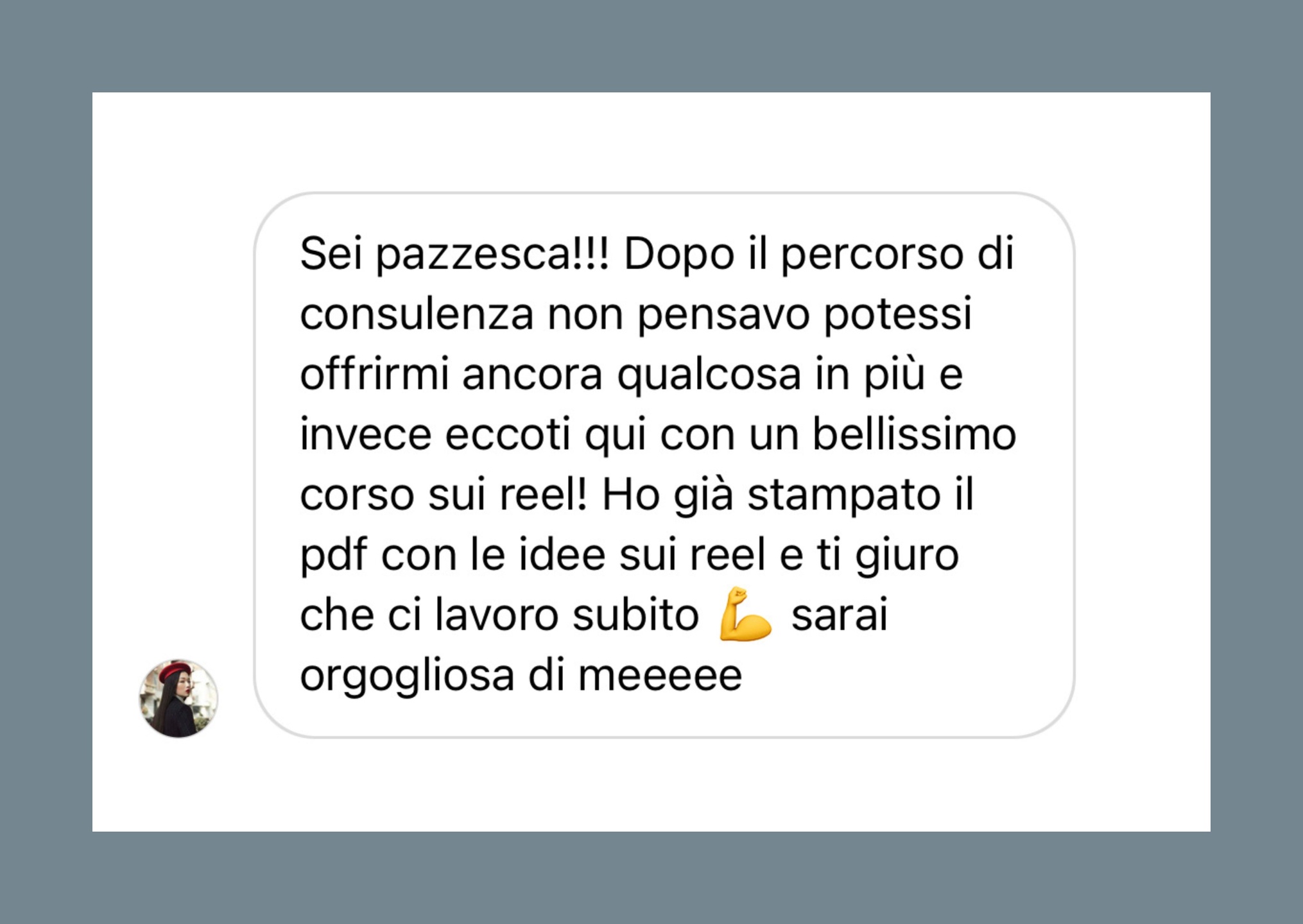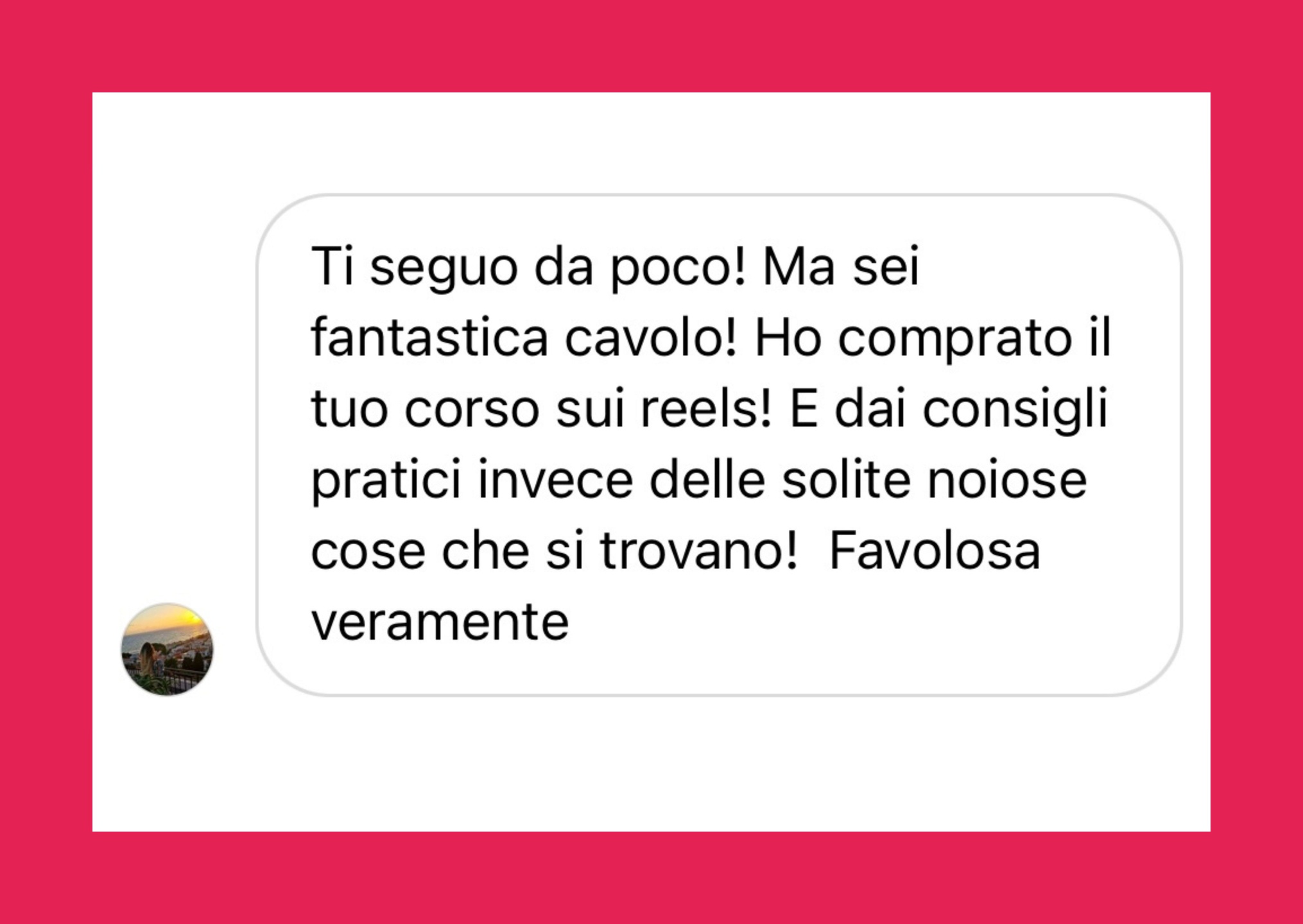 "Il tuo corso mi ha cambiato totalmente modo di vedere l'online: mi ha creato un lavoro. Questo grazie ai tuoi insegnamenti. Grazie."